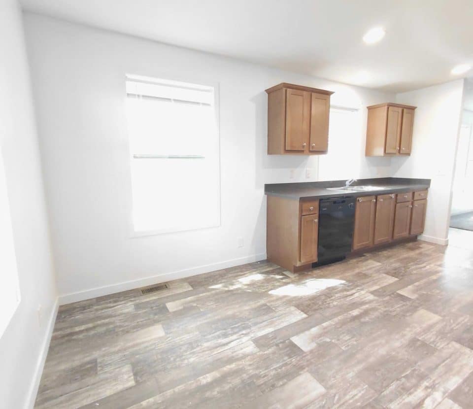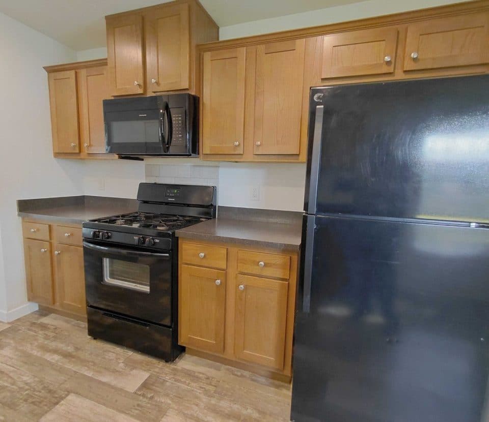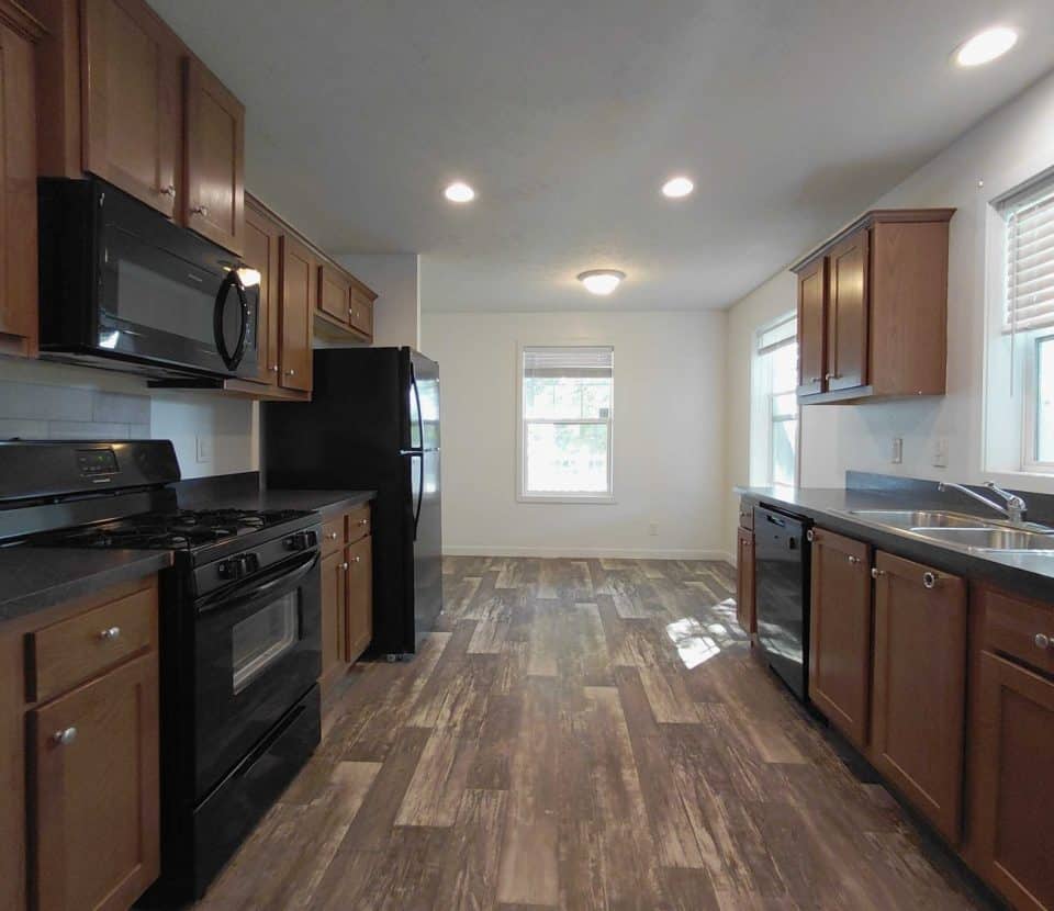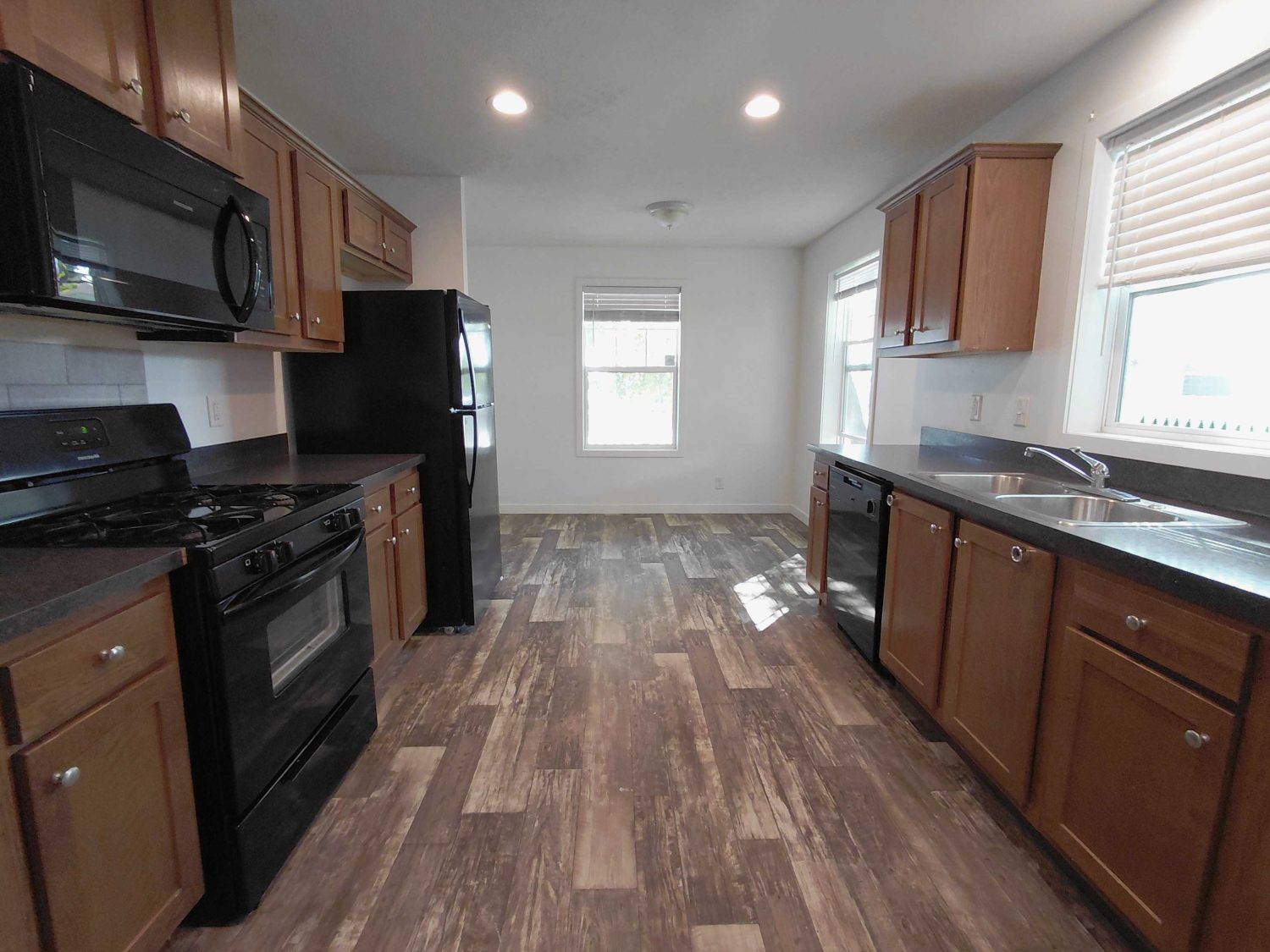 Enjoy a bright open interior featuring modern wood look flooring crisp white walls and recessed lighting The stylish kitchen is equipped with handsome wood cabinets dark countertops and a full set of black appliances including a dishwasher range and refrigerator