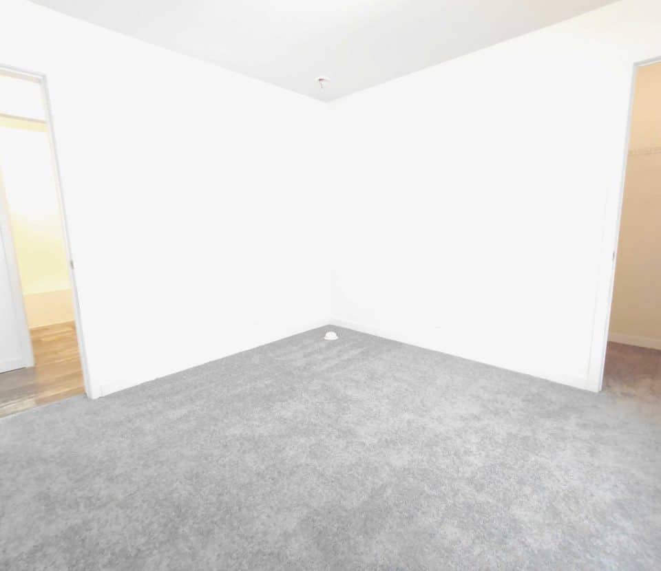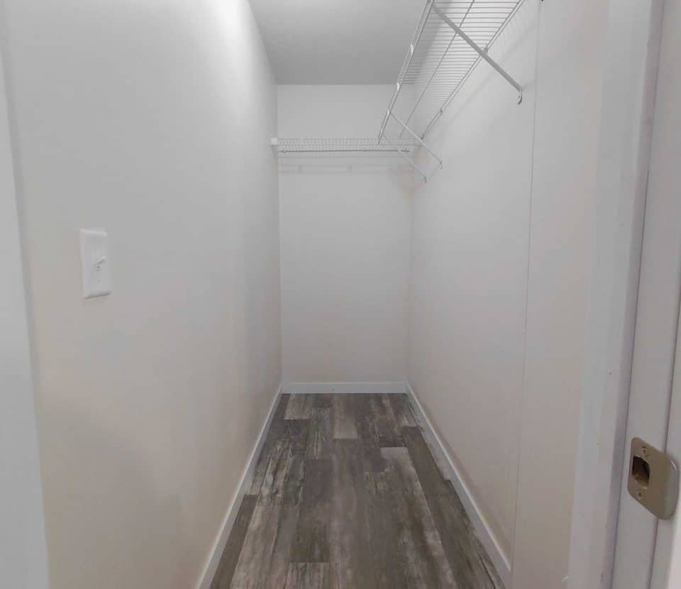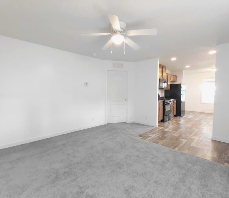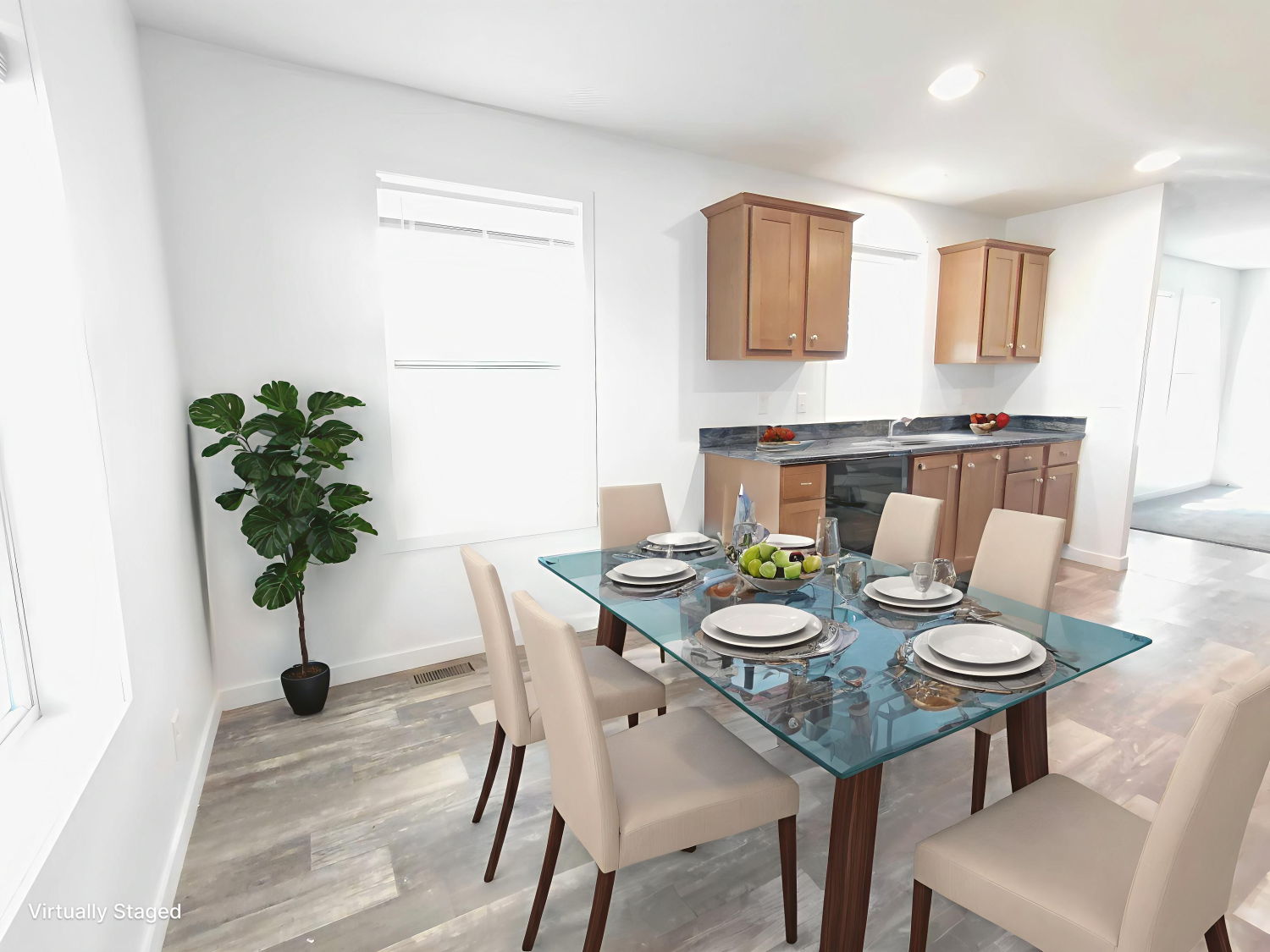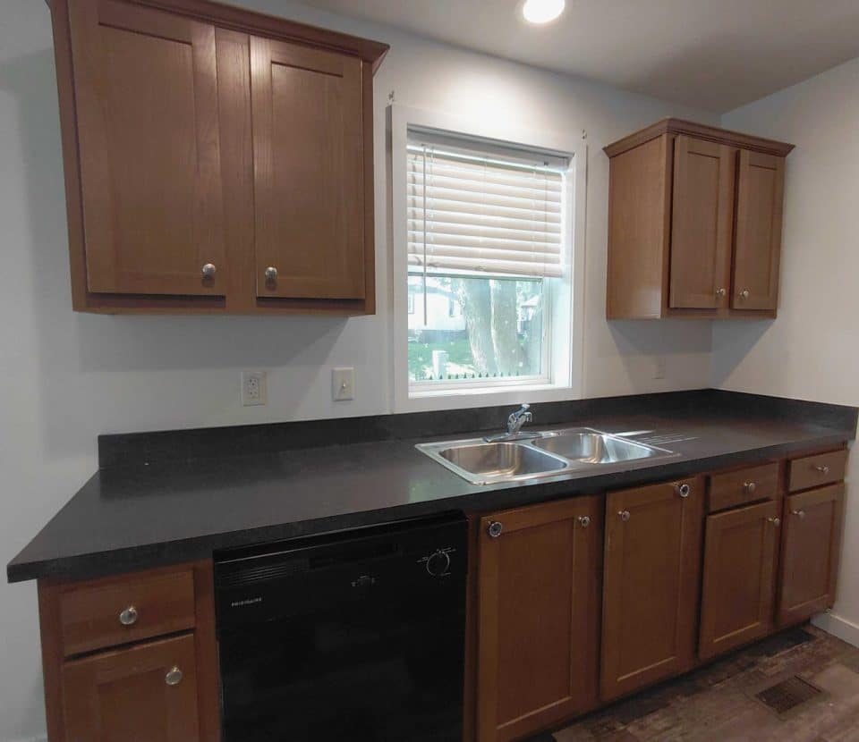 Enjoy a bright open interior featuring modern wood look flooring crisp white walls and recessed lighting The stylish kitchen is equipped with handsome wood cabinets dark countertops and a full set of black appliances including a dishwasher range and refrigerator