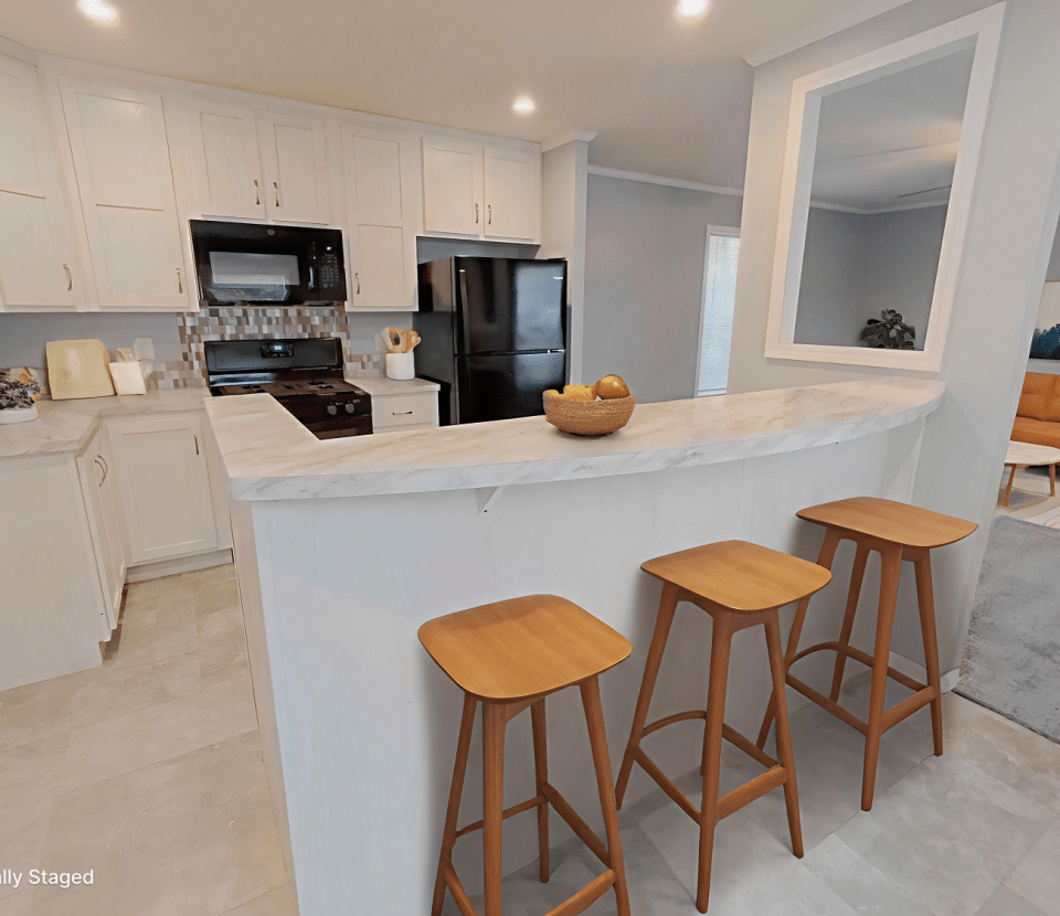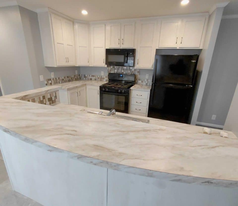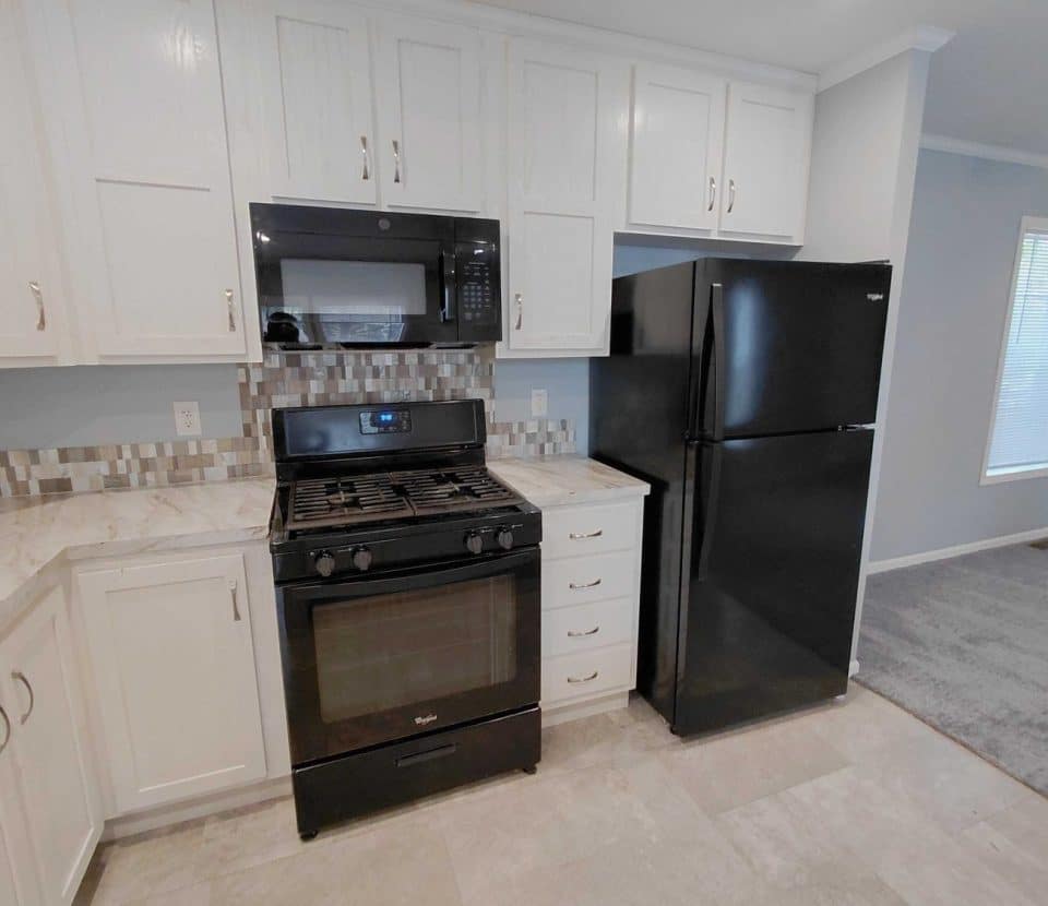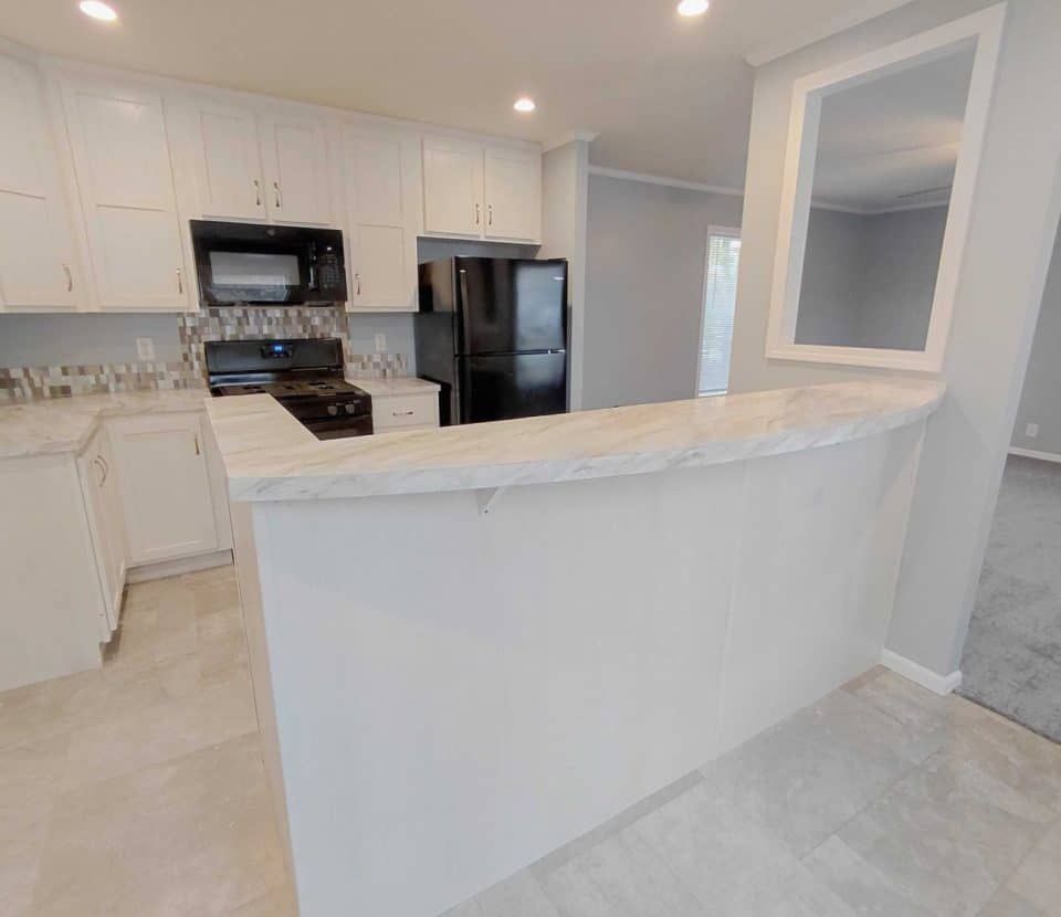 Sleek Kitchen Featuring a spacious marble look breakfast bar brilliant white shaker cabinets and a full black appliance package Perfect for entertaining